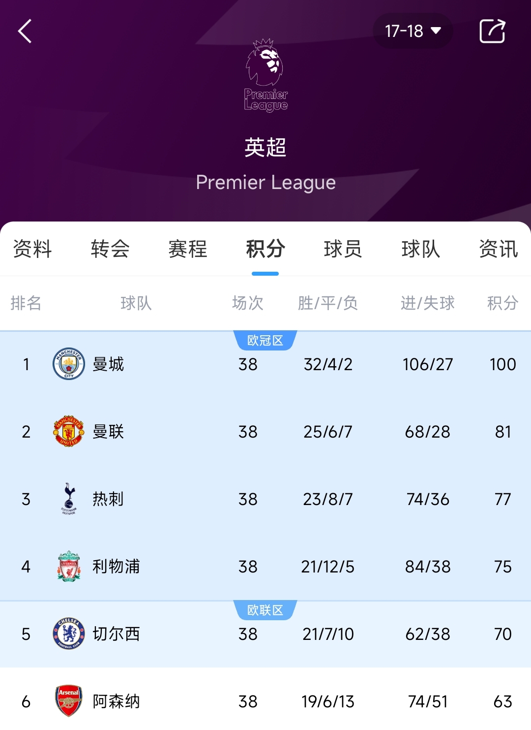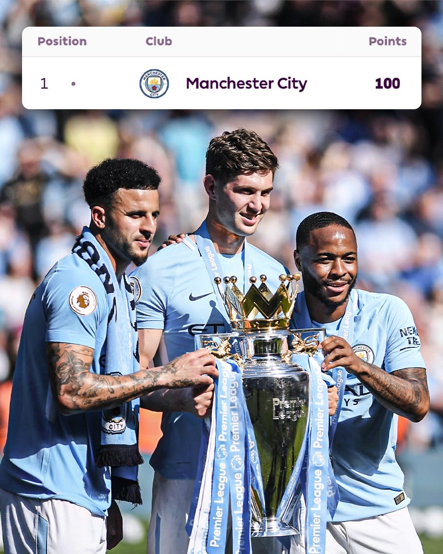 2017-18賽季,瓜迪奧拉率領(lǐng)曼城奪得英超冠軍,38輪比賽32勝4平2負(fù)積100分,創(chuàng)下英超單賽季積分紀(jì)錄,并一直保持到現(xiàn)在。