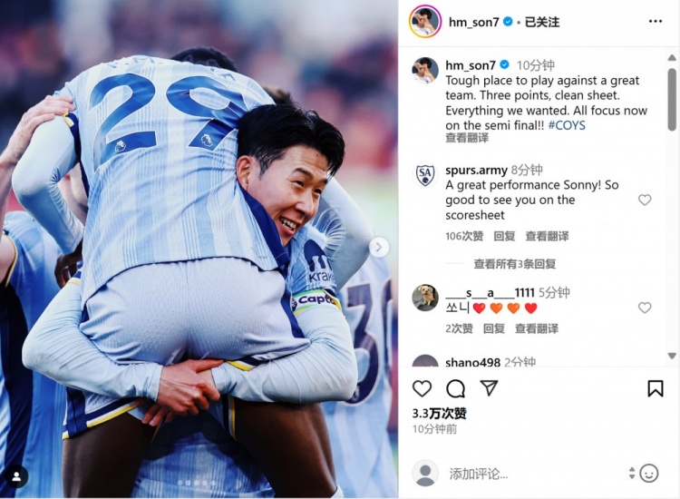 本場比賽孫興慜一次造烏龍還有一次助攻,賽后他也在個人社媒曬出與隊友相擁慶祝的照片,配文寫道:“一個艱難的客場面對一支出色的球隊,拿下三分,完成零封,這是我們?nèi)肯胍?,現(xiàn)在集中注意在聯(lián)賽杯半決賽。”