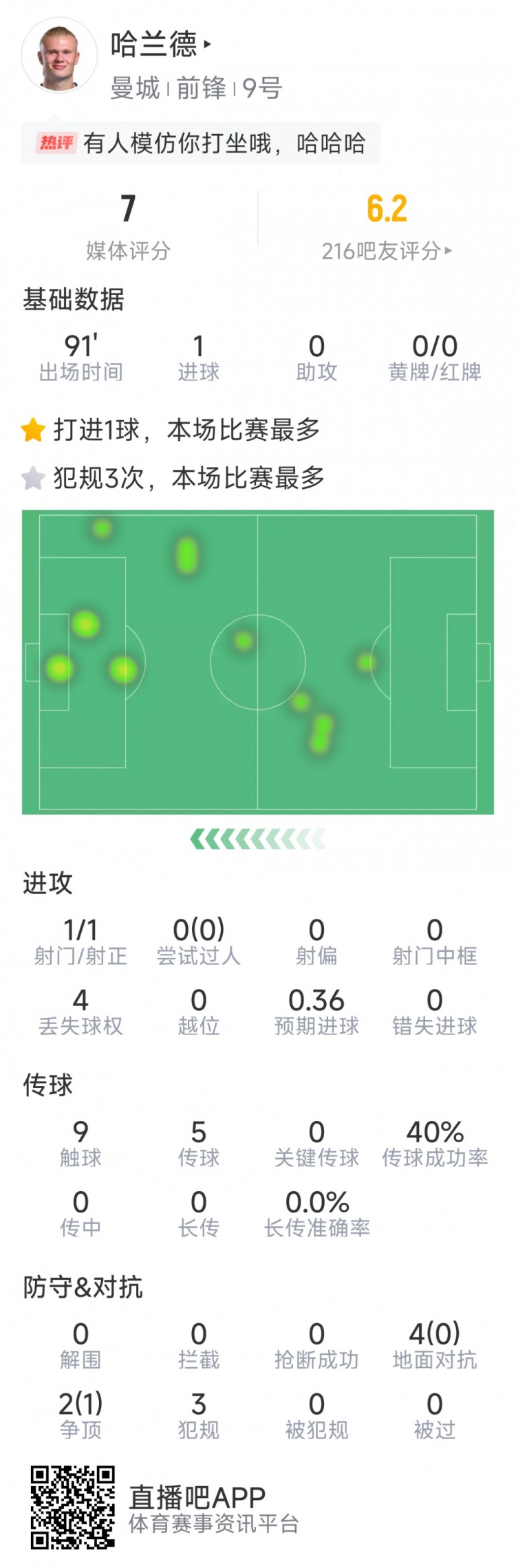 2月3日訊 在本輪英超,曼城1-5不敵阿森納,哈蘭德打進(jìn)一球,以下為他在本場(chǎng)數(shù)據(jù):