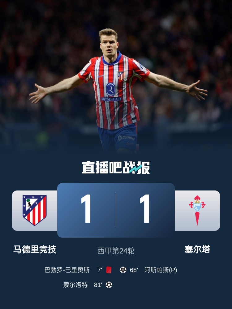 西甲-十人馬競1-1塞爾塔落后榜首1分 索爾洛特建功阿斯帕斯點射