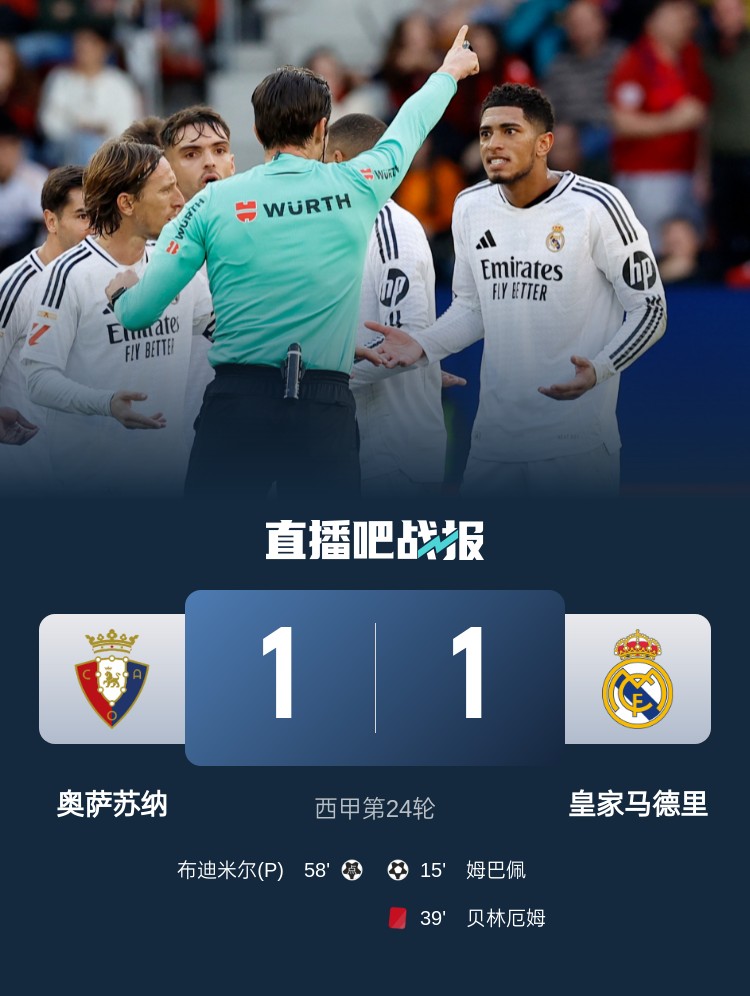 判罰爭議不斷!皇馬本輪1-1戰(zhàn)平奧薩蘇納,姆巴佩破門,貝林厄姆染紅。