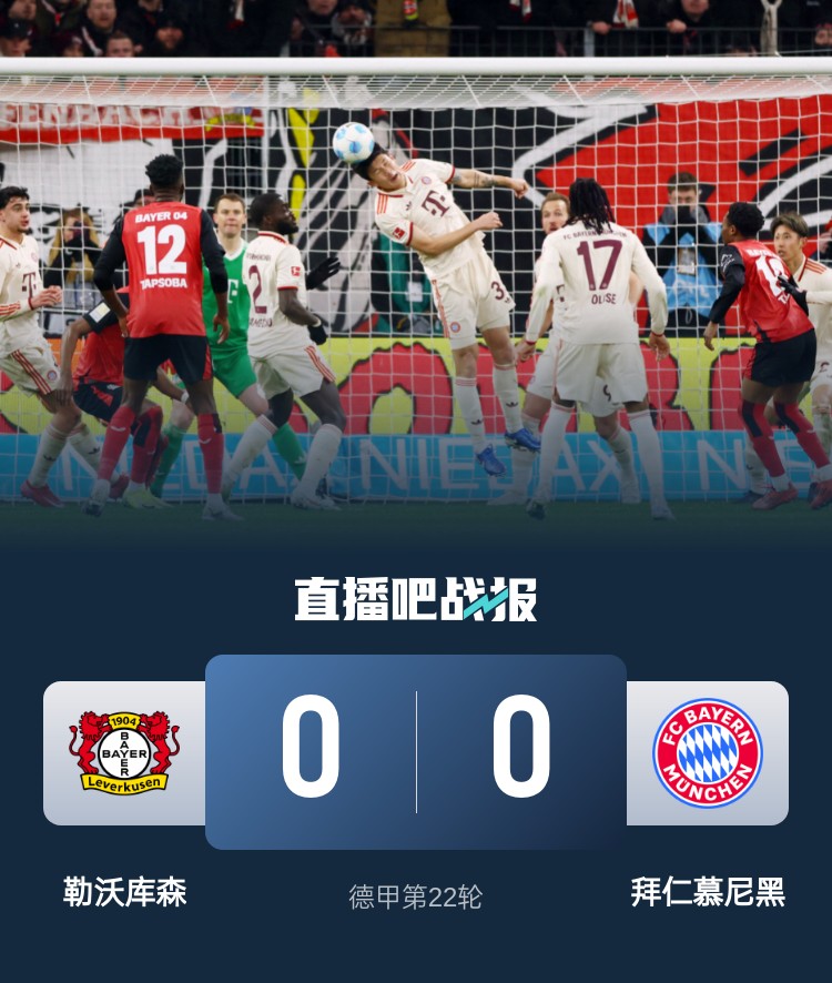 德甲本輪焦點大戰(zhàn),勒沃庫森0-0戰(zhàn)平拜仁。拜仁7連勝遭終結(jié),8分領(lǐng)跑聯(lián)賽。